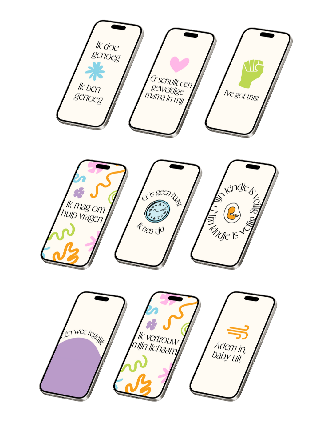 Een set van 10 affirmatie wallpapers voor je telefoon, speciaal voor zwangerschap en bevalling.